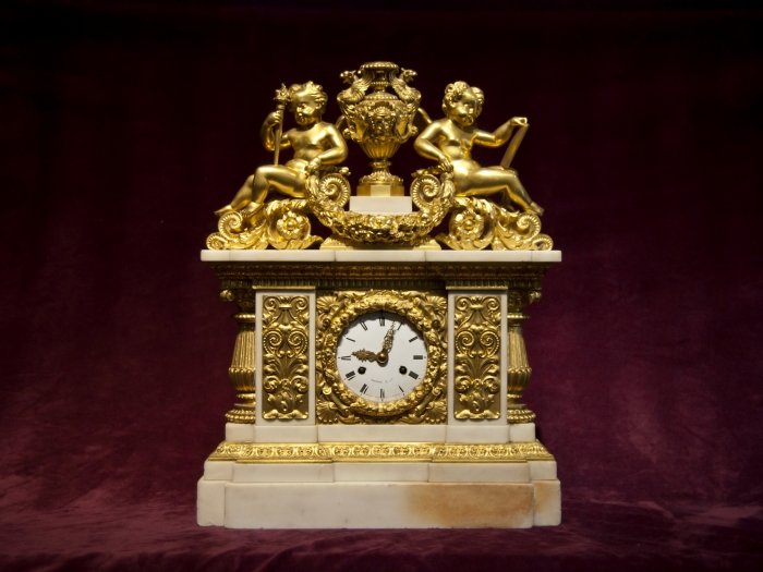 Thomire & Co. French gilt bronze mounted white marble mantel clock