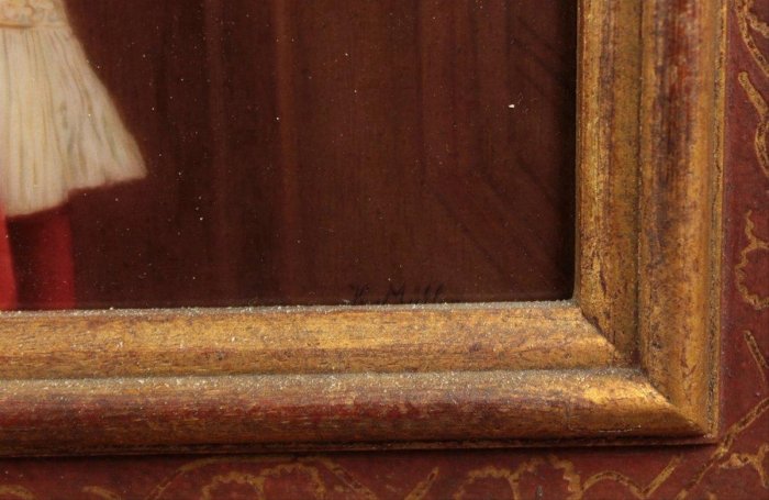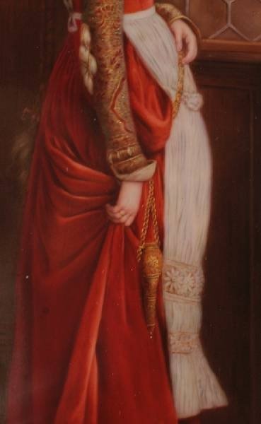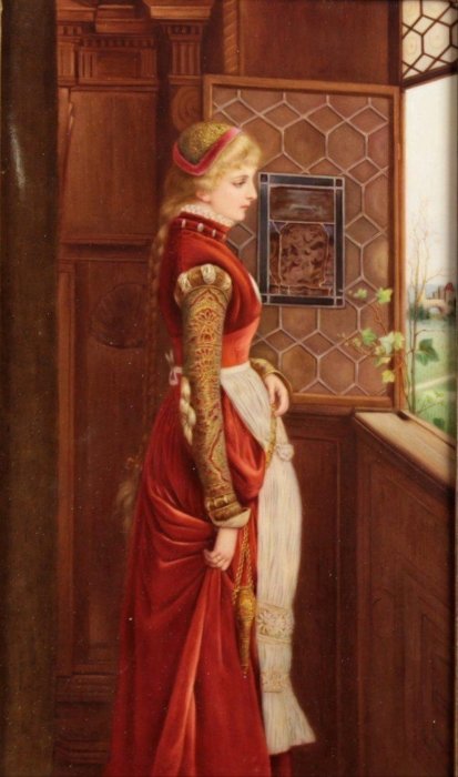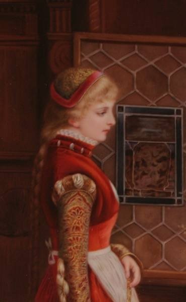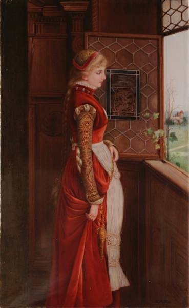 Late 19th C. Depicting a fair haired maiden in Renaissance attire in an interior gazing out of an open window, signed K. Muller, impressed scepter over K.P.M. and H, framed.