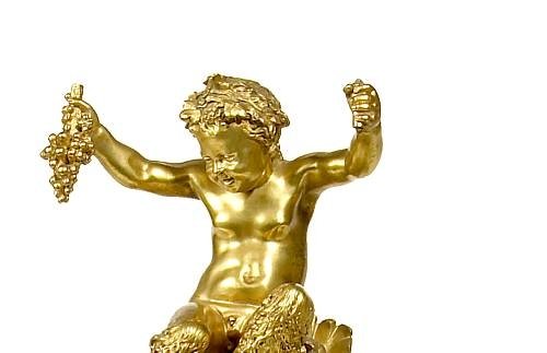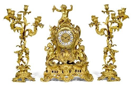 A Napoleon III gilt bronze three piece clock set.Roman numerals movement stamped G.D. the case signed Clodion.