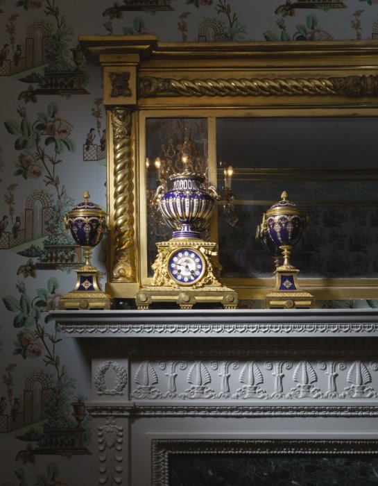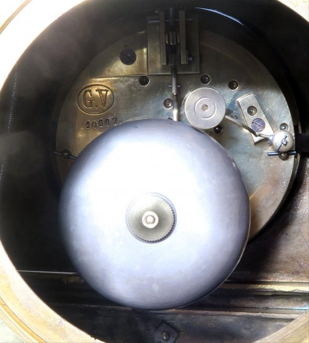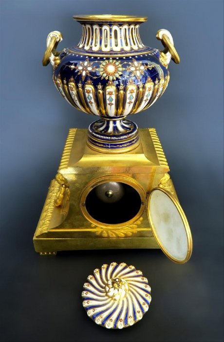 F. Barbedienne, Gilt-bronze & Sevres-style porcelain matched mantel clock garniture, French 1880,3.5" dial with cartouche numerals, bell striking movement with Brocot escapement, lion mask handles & surmounted by potpourri vase together with an pair of urns