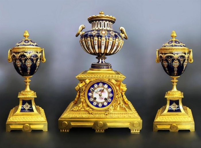 - F. Barbedienne, French Circa 1880 Gilt Bronze And Sevres Porcelain Clock Set 3Pcs