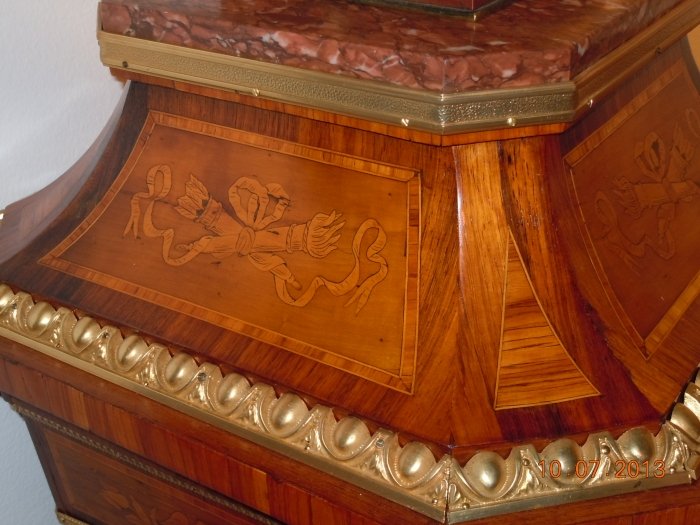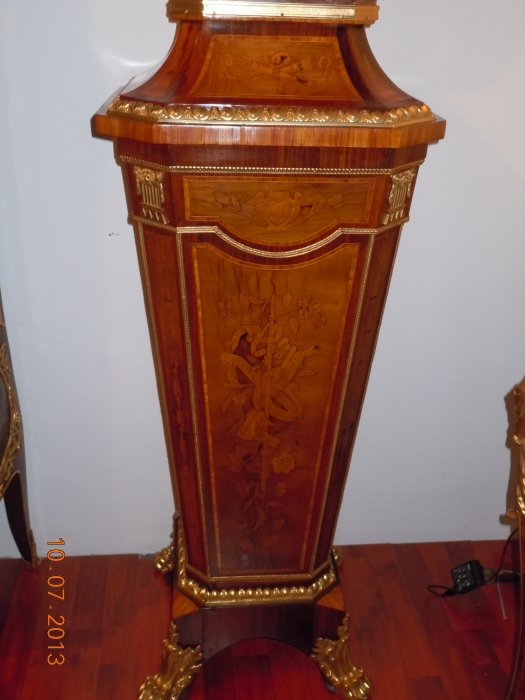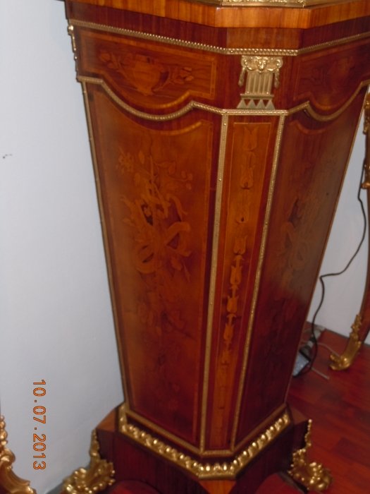 French Gilt Bronze Mounted Marquetery, Kingwood and rosewood, red Marble top Louis XVI Style Pedestal, Paris 1880