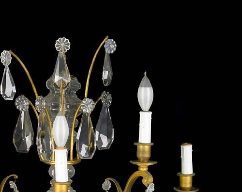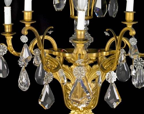 Late 19th Century. Foliate scroll branches suspending flowerheads & facet cut prisms emanating from a spreading foliate backplate surmounted by glass knopped finials and flared corona.