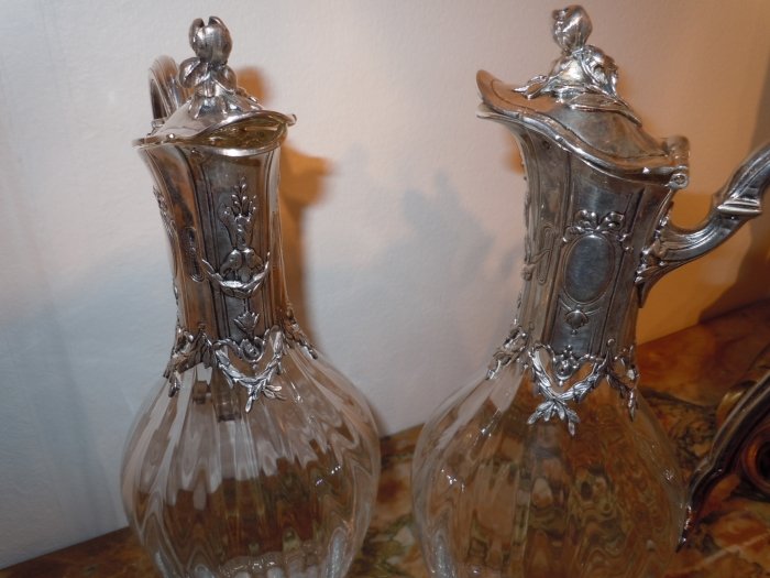 • Odiot and Tetard signed Pair of Silver mounted crystal Claret Jugs