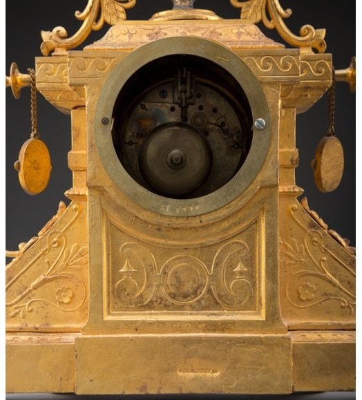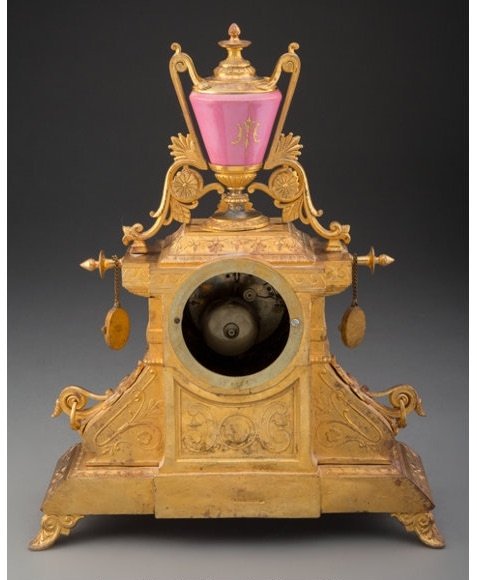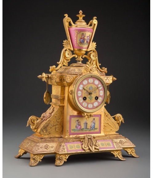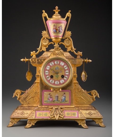 The table clock, surmounted by porcelain vase, flanked by two hanging roundels, atop base supported by six feet.